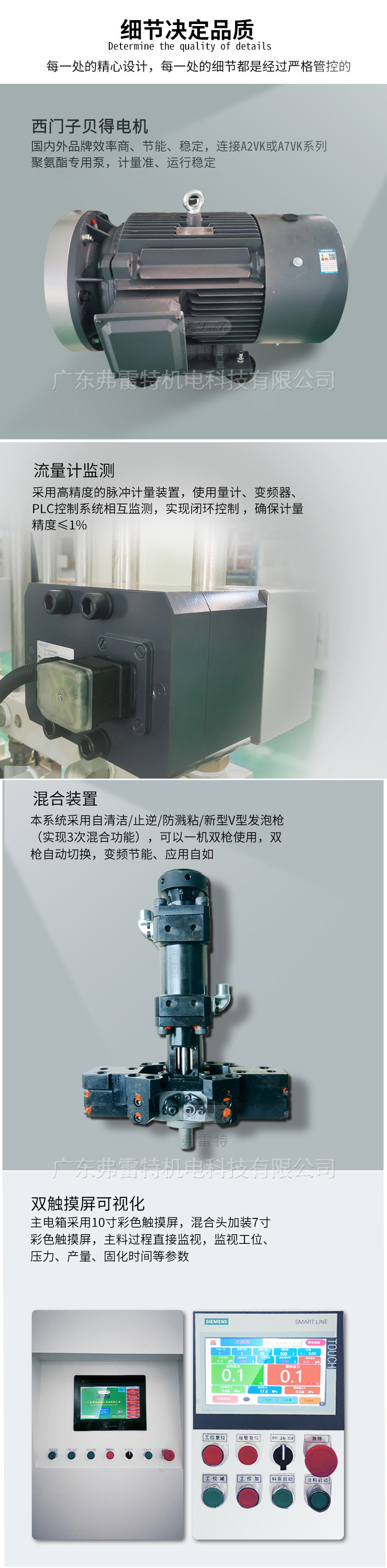 4、混合裝置:采用自清潔/止逆/防濺粘/新型V型(實(shí)現(xiàn)3次混合功能)發(fā)泡槍,結(jié)構(gòu)美觀,操作方便。配合西門子聚氨酯專用泵,注射準(zhǔn)確,混合效果好。